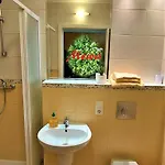 Rummen erbjuder utsikt över trädgården. Det finns badkar och dusch för din bekvämlighet.